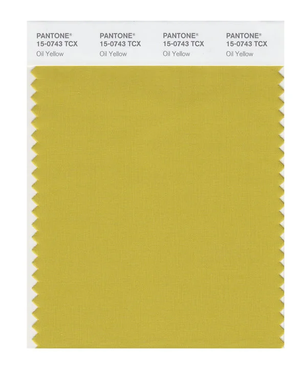 Oil Yellow is a medium-toned color from the Pantone TCX collection, identified by the code 15-0743 TCX. This warm tone with its balanced character makes it an excellent choice for warm luxury, artisanal products, and natural branding.