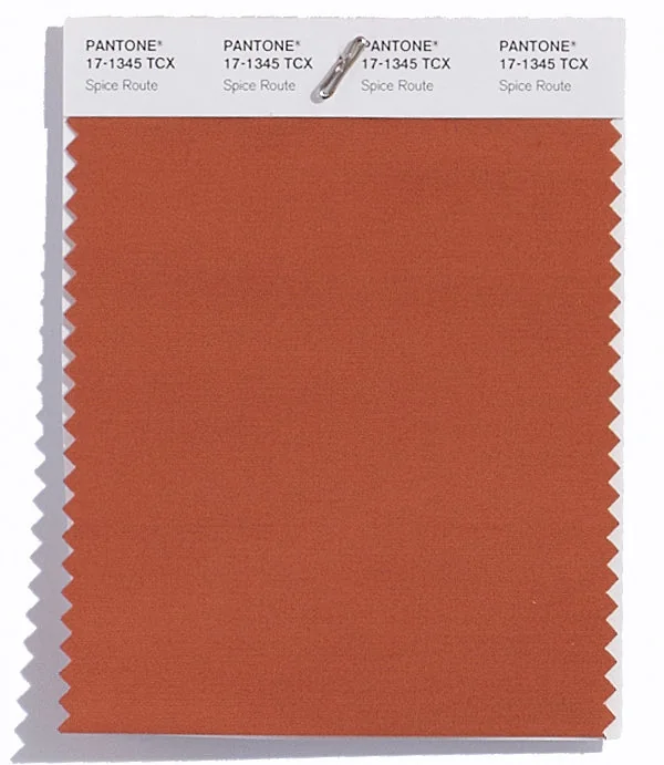 Spice Route is a medium-toned color from the Pantone TCX collection, identified by the code 17-1345 TCX. This warm tone with its balanced character makes it an excellent choice for luxury fashion, dramatic interiors, and premium branding.