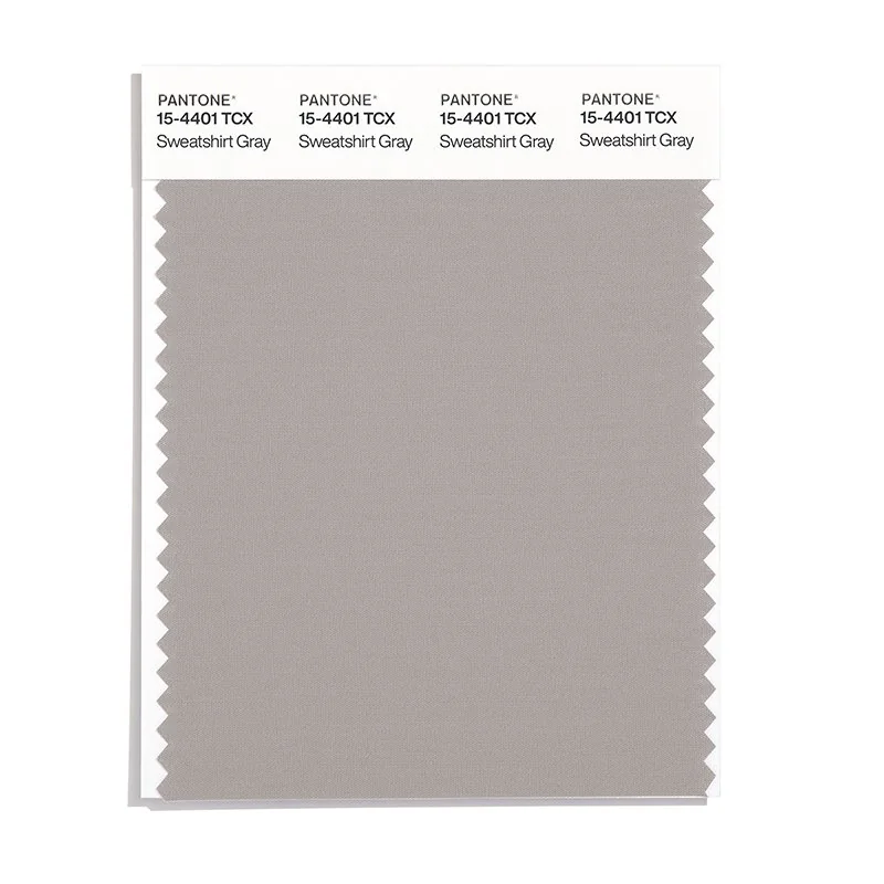 Sweatshirt Gray is a medium-toned color from the Pantone TCX collection, identified by the code 15-4401 TCX. This warm tone with its balanced character makes it an excellent choice for soft femininity, wellness branding, and gentle aesthetics.