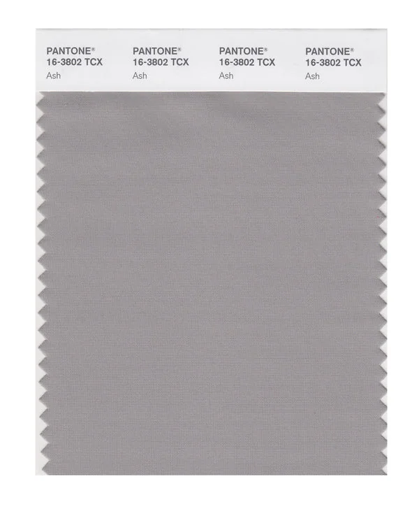 Ash is a medium-toned gray from the Pantone TCX collection, identified by the code 16-3802 TCX. This warm tone with its balanced character makes it an excellent choice for professional environments, industrial design, and neutral foundations.