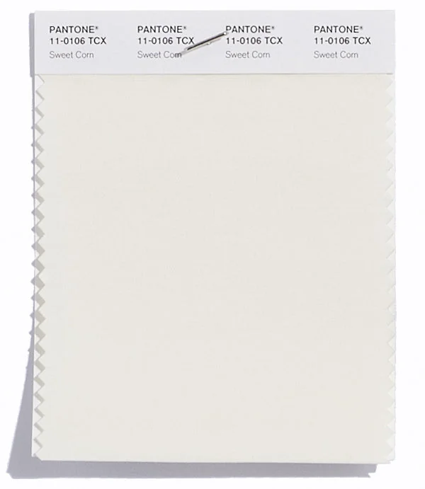 Sweet Corn is a light and airy color from the Pantone TCX collection, identified by the code 11-0106 TCX. This warm tone with its soft and pastel character makes it an excellent choice for gentle optimism, baby products, and soft branding.