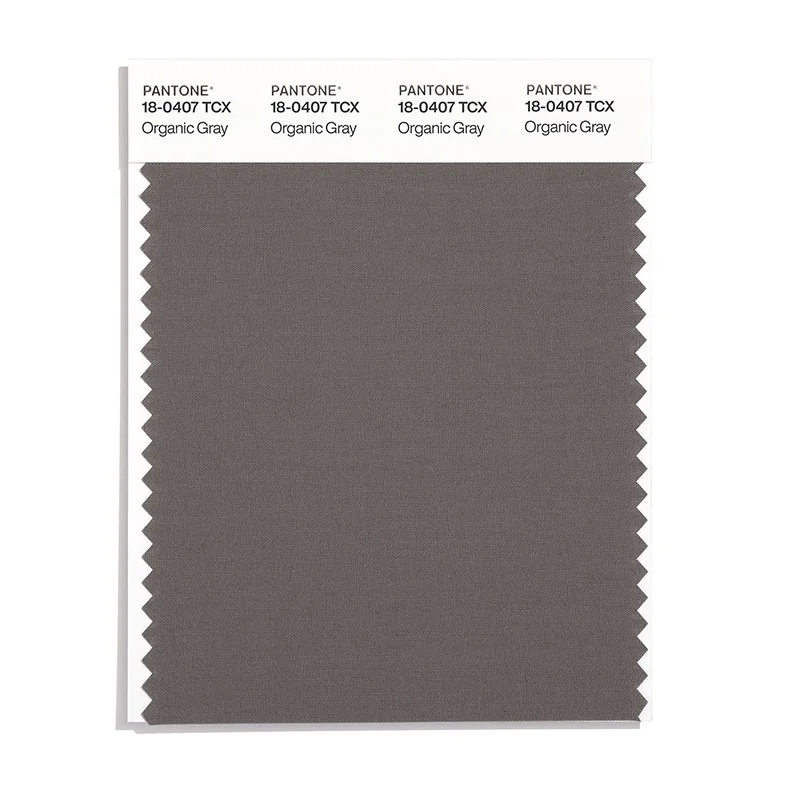 Organic Gray is a medium-toned color from the Pantone TCX collection, identified by the code 18-0407 TCX. This warm tone with its balanced character makes it an excellent choice for sophisticated neutrals, urban design, and modern aesthetics.