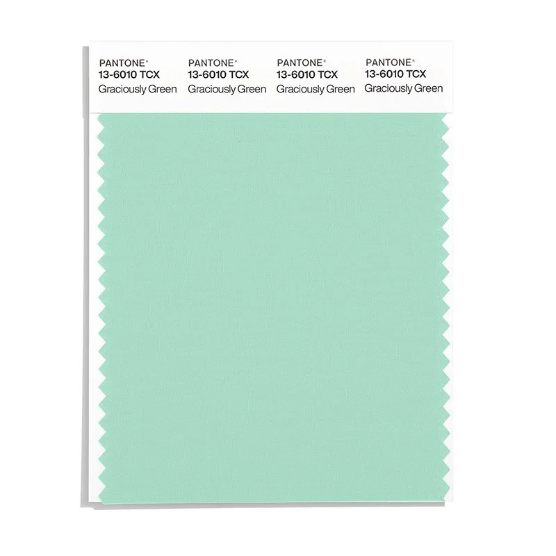 Graciously Green is a light and airy color from the Pantone TCX collection, identified by the code 13-6010 TCX. This cool tone with its balanced character makes it an excellent choice for tropical themes, jewelry design, and exotic branding.