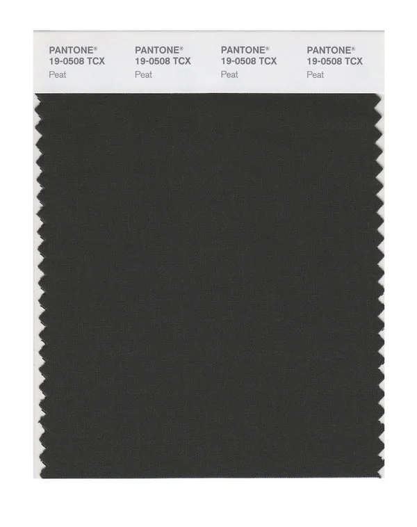 Peat is a deep and rich black from the Pantone TCX collection, identified by the code 19-0508 TCX. This warm tone with its balanced character makes it an excellent choice for luxury branding, formal wear, and sophisticated design.