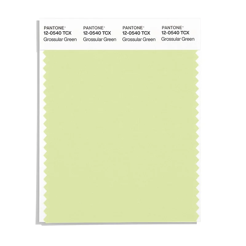 Grossular Green is a light and airy yellow from the Pantone TCX collection, identified by the code 12-0540 TCX. This cool tone with its balanced character makes it an excellent choice for optimistic branding, children's products, and energizing spaces.
