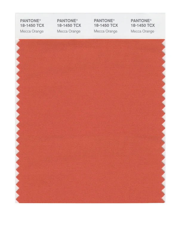 Mecca Orange is a medium-toned color from the Pantone TCX collection, identified by the code 18-1450 TCX. This warm tone with its balanced character makes it an excellent choice for luxury fashion, dramatic interiors, and premium branding.