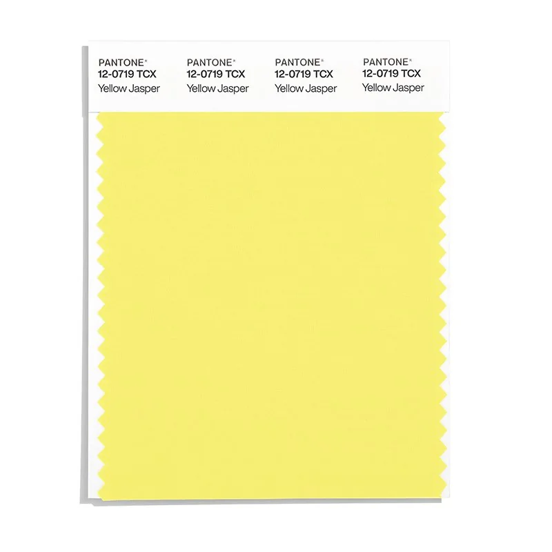 Yellow Jasper is a medium-toned yellow from the Pantone TCX collection, identified by the code 12-0719 TCX. This warm tone with its vibrant and bold character makes it an excellent choice for optimistic branding, children's products, and energizing spaces.