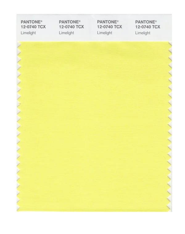 Limelight is a light and airy yellow from the Pantone TCX collection, identified by the code 12-0740 TCX. This warm tone with its vibrant and bold character makes it an excellent choice for optimistic branding, children's products, and energizing spaces.
