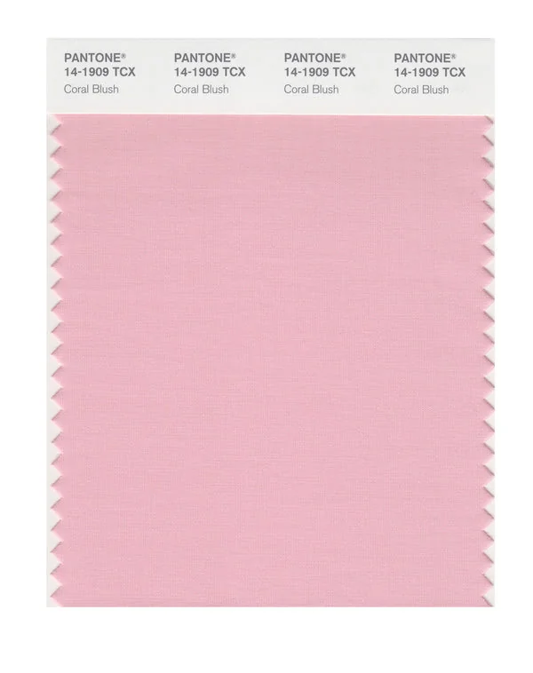 Coral Blush is a light and airy pink from the Pantone TCX collection, identified by the code 14-1909 TCX. This warm tone with its balanced character makes it an excellent choice for feminine products, romantic themes, and wellness branding.