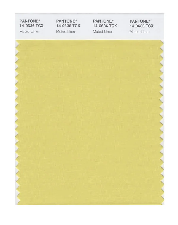 Muted Lime is a medium-toned yellow from the Pantone TCX collection, identified by the code 14-0636 TCX. This warm tone with its balanced character makes it an excellent choice for optimistic branding, children's products, and energizing spaces.