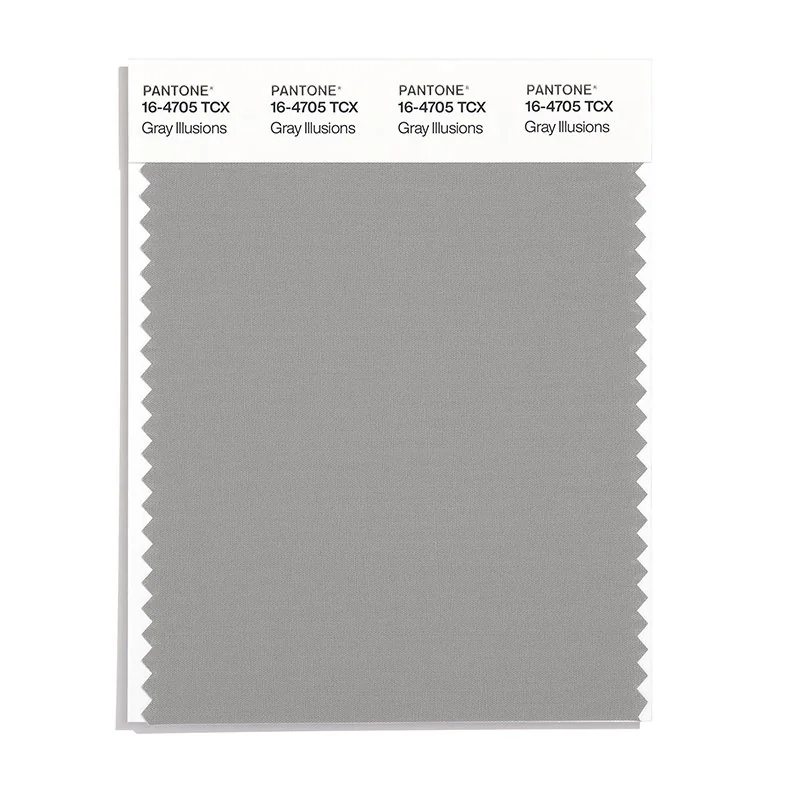 Gray Illusions is a medium-toned gray from the Pantone TCX collection, identified by the code 16-4705 TCX. This warm tone with its balanced character makes it an excellent choice for professional environments, industrial design, and neutral foundations.