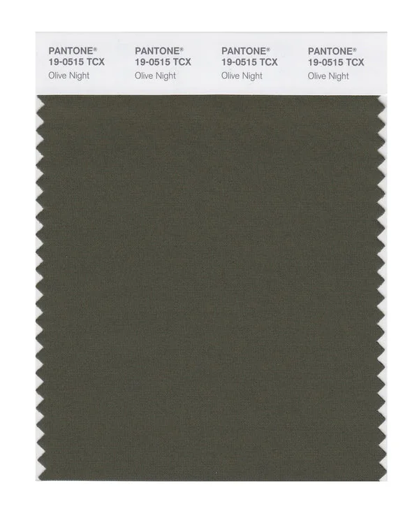 Olive Night is a deep and rich color from the Pantone TCX collection, identified by the code 19-0515 TCX. This warm tone with its balanced character makes it an excellent choice for natural products, military themes, and earthy design.