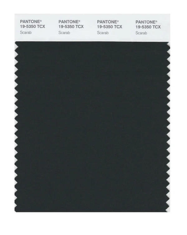Scarab is a deep and rich color from the Pantone TCX collection, identified by the code 19-5350 TCX. This cool tone with its balanced character makes it an excellent choice for sophisticated branding, medical products, and calming design.