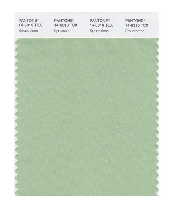 Sprucestone is a medium-toned green from the Pantone TCX collection, identified by the code 14-6316 TCX. This cool tone with its balanced character makes it an excellent choice for sustainability, nature brands, and eco-friendly design.