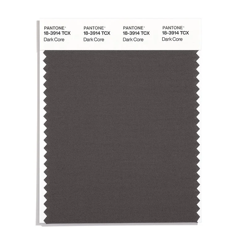 Dark Core is a medium-toned black from the Pantone TCX collection, identified by the code 18-3914 TCX. This warm tone with its balanced character makes it an excellent choice for luxury branding, formal wear, and sophisticated design.