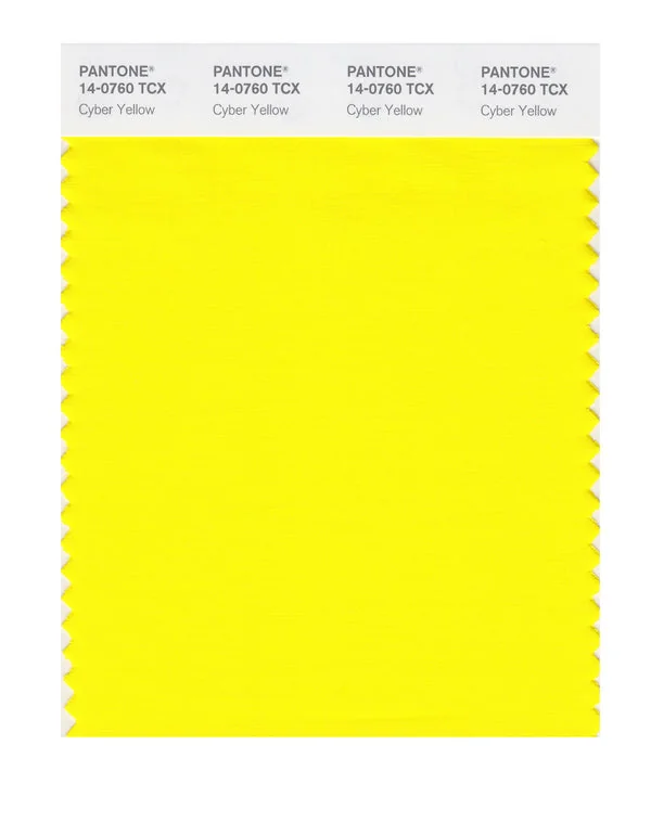 Cyber Yellow is a medium-toned color from the Pantone TCX collection, identified by the code 14-0760 TCX. This warm tone with its vibrant and bold character makes it an excellent choice for warm luxury, artisanal products, and natural branding.